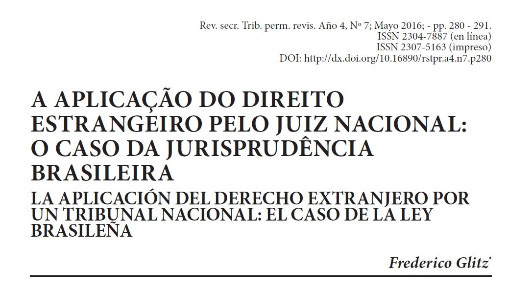 REFERÊNCIA: GLITZ, Frederico E. Z. A aplicação do Direito estrangeiro pelo juiz nacional: o caso da jurisprudência brasileira. Revista da Secretaria do Tribunal Permanente de Revisão do Mercosul, Ano 4, n. 7, Maio 2016, p. 280-291.