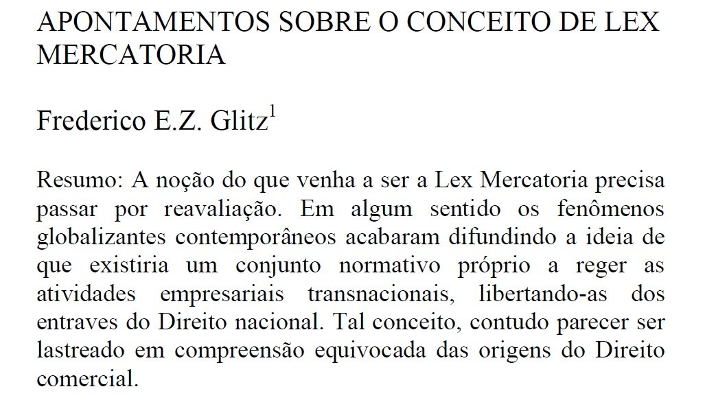 REFERÊNCIA: GLITZ, Frederico Eduardo Zenedin . Apontamentos sobre o Conceito de Lex Mercatoria. Revista Jurídica UNICURITIBA, v.1, n. 28, 2012.