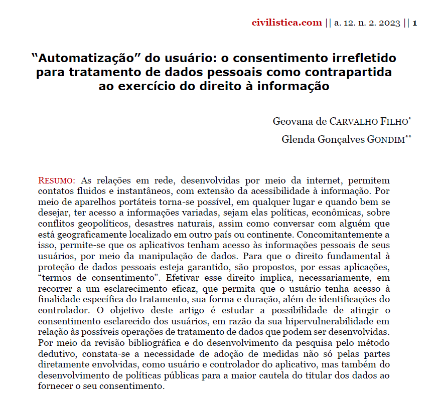 TÍTULO: “Automatização” do usuário: o consentimento irrefletido para tratamento de dados pessoais como contrapartida ao exercício do direito à informação