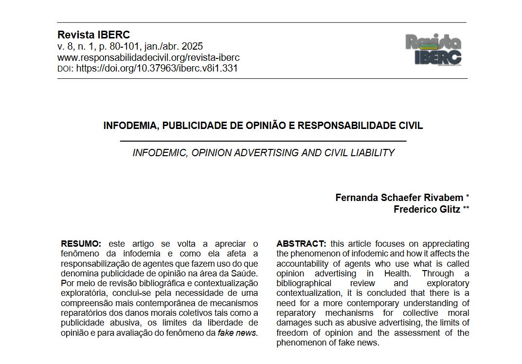 REFERÊNCIA: RIVABEM, Fernanda Schaefer; GLITZ, Frederico.Infodemia, publicidade de opinião e responsabilidade civil.Revista IBERC, Belo Horizonte, v. 8, n. 1, p. 80-101, jan./abr. 2025.