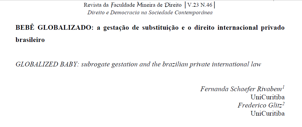 REFERÊNCIA: RIVABEM, Fernanda Schaefer; GLITZ, Frederico E. Z. BEBÊ GLOBALIZADO: a gestação de substituição e o direito internacional privado brasileiro. Revista da Faculdade Mineira de Direito, v.23, n. 46, 2020, p. 249-270.