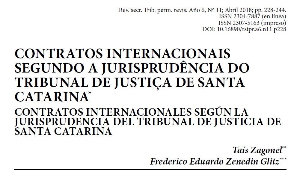 REFERÊNCIA: ZAGONEL, Tais; GLITZ, Frederico Eduardo Zenedin. Contratos internacionais segundo a jurisprudência do Tribunal de Justiça de Santa Catarina. In Rev. secr. Trib. perm. revis. Año 6, Nº 11; Abril 2018; pp. 228-244.
