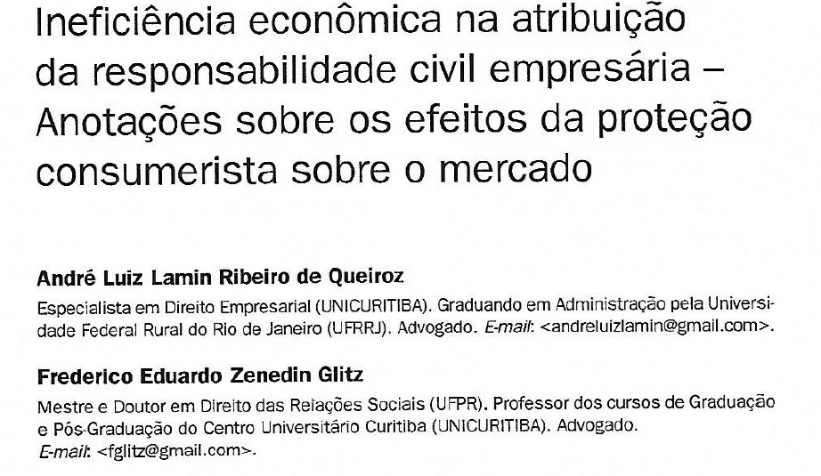 REFERÊNCIA: QUEIROZ, A. L. L. R. ; GLITZ, Frederico Eduardo Zenedin . INEFICIÊNCIA ECONÔMICA NA ATRIBUIÇÃO DA RESPONSABILIDADE CIVIL EMPRESÁRIA: ANOTAÇÕES SOBRE OS EFEITOS DA PROTEÇÃO CONSUMERISTA SOBRE O MERCADO. Revista Direito Empresarial (Curitiba), v. 3, p. 01-20, 2014.