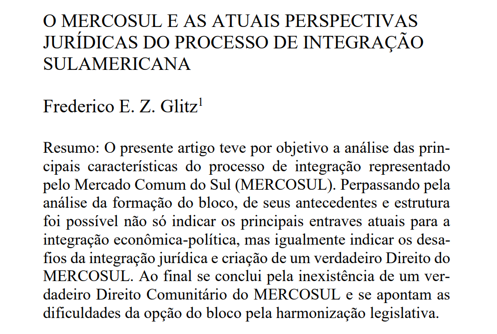 REFERÊNCIA: GLITZ, Frederico E. Z. O MERCOSUL e as atuais perspectivas jurídicas do processo de integração sulamericana. RJLB, Ano 5 (2019), nº 5, p. 583-610.