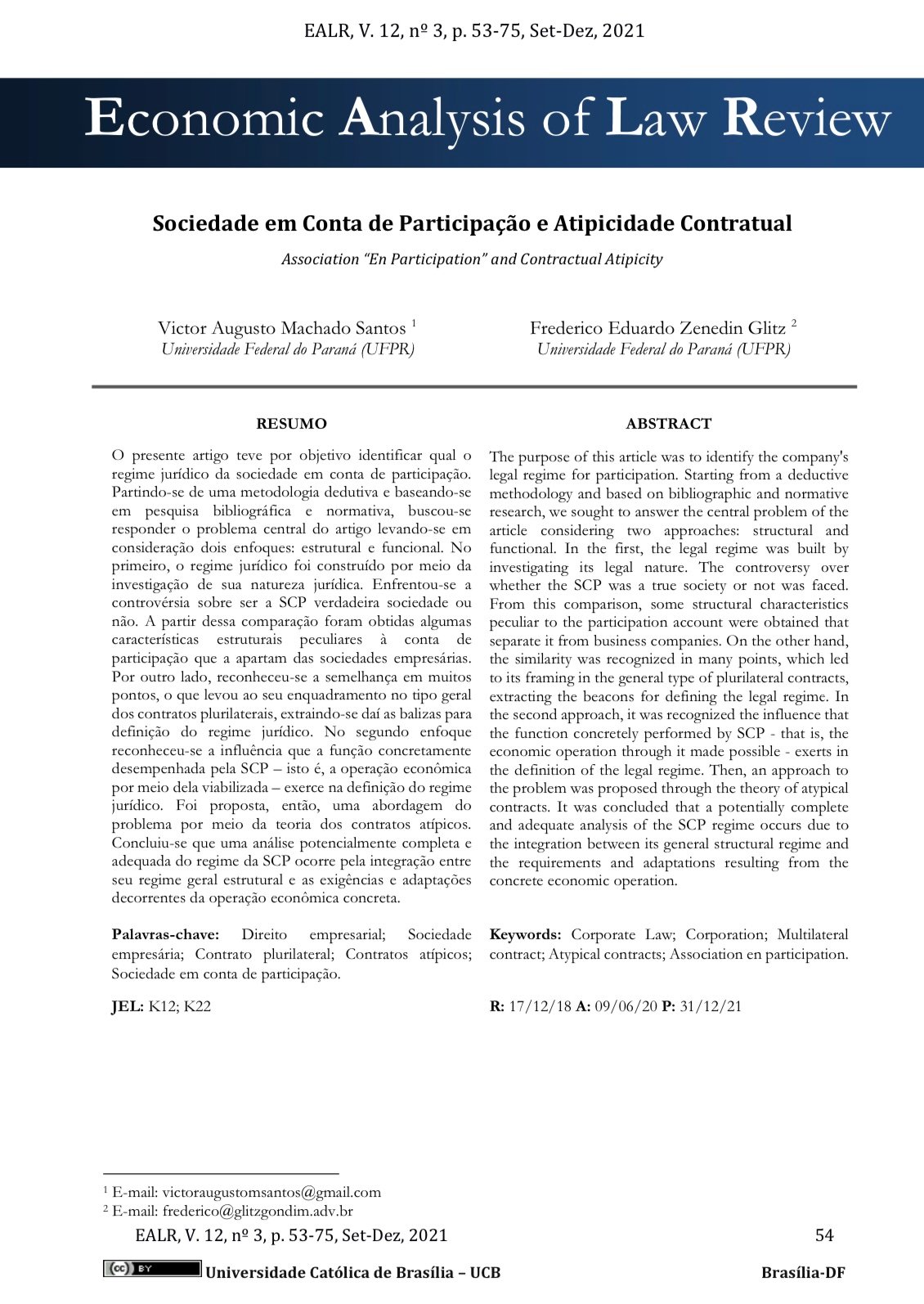 REFERÊNCIA: SANTOS, Victor A. M.; GLITZ, Frederico E. Z. Sociedade em conta de participação e atipicidade contratual. In Economic Analysis of Law Review, v. 12., n. 3., p.53-75, Set.-Dez. 2021.