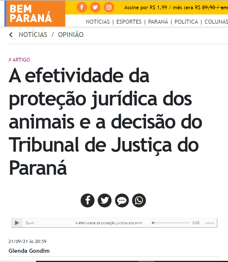 Recentemente, a 7ª Câmara Cível do Tribunal de Justiça do Paraná decidiu pela legitimidade dos animais não humanos para figurarem como autores de uma ação judicial, que versa sobre o pedido de pensão e indenização, em razão dos maus tratos e a privação da liberdade sofridos por dois cães.